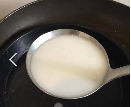 锅烧开水保持小火,准备一个不锈钢盘,舀一勺粉浆入盘中,转匀(布满盘疷),等液体变白,倾斜盘子,让沸水流入盘中,等粉皮透明。