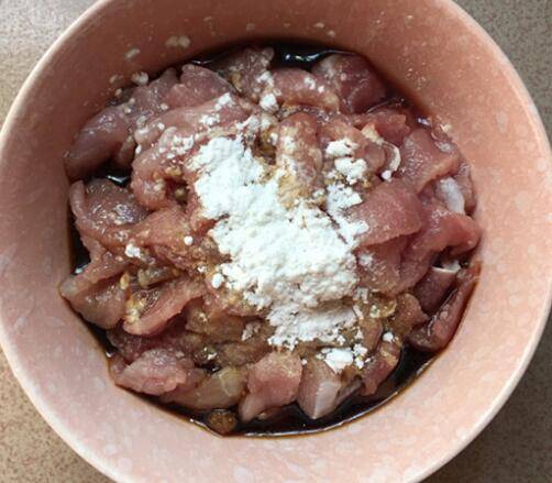 2、瘦肉洗净切片,调酱油、鸡粉、料酒搅拌均匀腌制片刻,然后再加入少许淀粉抓匀,最后滴几滴食用油拌匀。