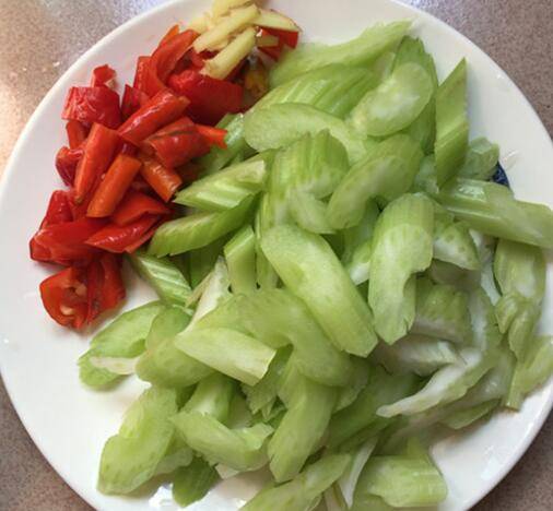 3、芹菜掐掉老筋,斜切厚片,红椒切块,生姜切丝。