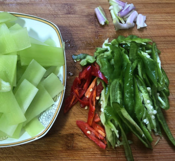3、莴笋去皮洗净,切薄片,辣椒洗净后切片,葱梗拍几刀切成段,容易出香味,用葱头代替也可。