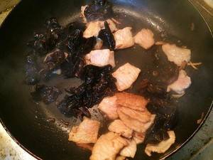 7、加入切好的木耳,加入适量酱油,继续翻炒。