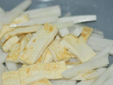油锅烧热,放入萝卜,豆腐煸炒至萝卜变脆,大概3分钟左右。