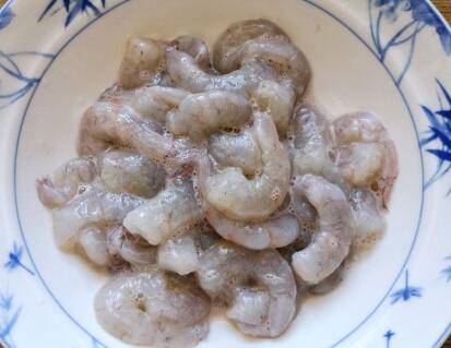 将虾仁放入碗中,加少量盐。用手抓匀放置5分钟(用盐先抓洗一下就可以洗去表面的黏液,这样炒出来的虾仁才会清脆好吃)。