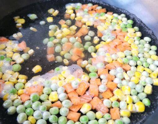 将青豆,玉米粒,胡萝卜丁入开水焯2-3分钟。