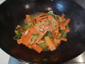 用料:胡萝卜3根、肉150克、大葱1根、青椒3个、朝天椒2个、青蒜2根、老抽半勺、生抽1勺、盐适量。