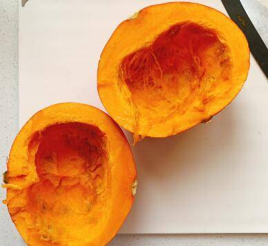 1、日本南瓜对半切开,把南瓜籽挖掉。