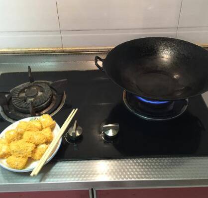 在面包糠里翻滚,油锅加热。