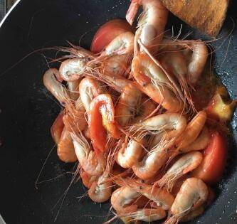 再把大虾倒入锅中和番茄一起翻炒。