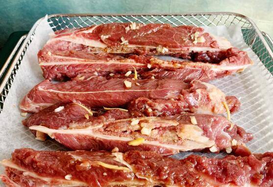 3、将腌制好的扇子骨放到垫了油纸的烤网里。