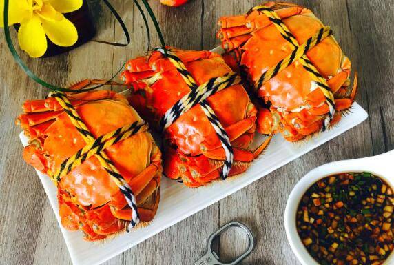 8、大闸蟹熟后,用剪子剪去绳子沾汁即可。