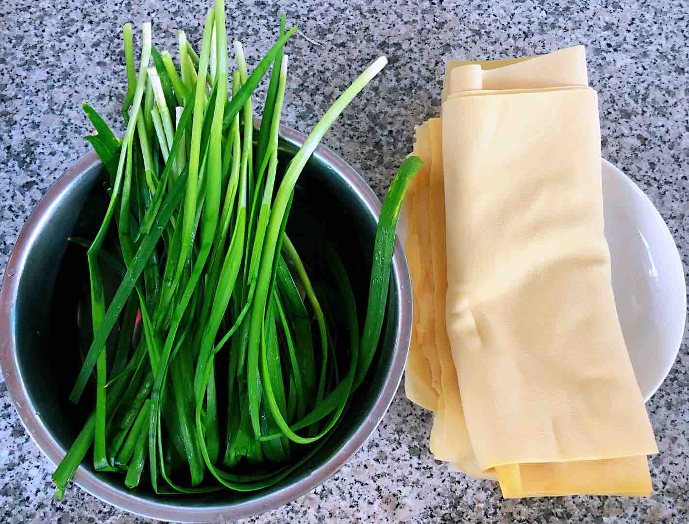 1、准备材料:千张100克、韭菜80克、蒜10克、油0.5勺、盐2匙、味精0.2匙。