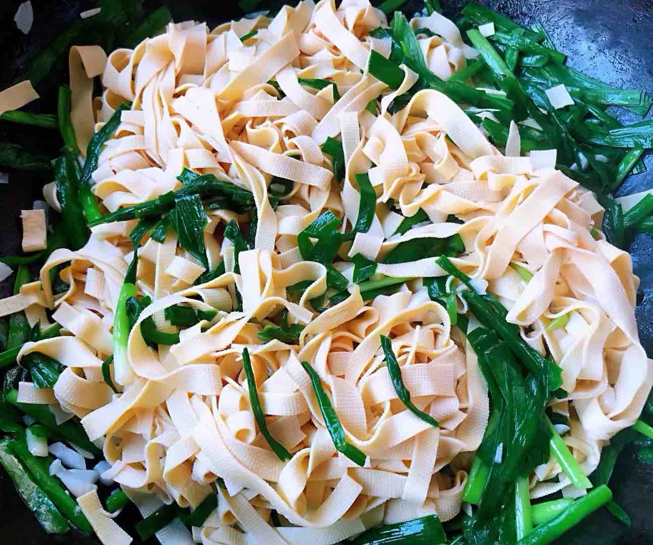 最佳答案韭菜炒千张丝的做法:1、准备材料:千张100克、韭菜80克、蒜10克、油0.5勺、盐2匙、味精0.2匙。2、韭菜摘好洗净切段。3、千张切成一厘米左右的丝状。4、锅中烧开水,放入千张丝焯水,去除豆腥味。5、焯好水的千张丝立即放入冷水中过凉,沥干水分。6、锅中倒入底油加热放入蒜粒爆香。7、放入千张丝,...