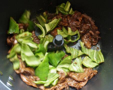 倒入腌制后的猪肝盖锅爆炒1分钟,开锅倒入青椒继续爆炒直至程序结束,出锅。