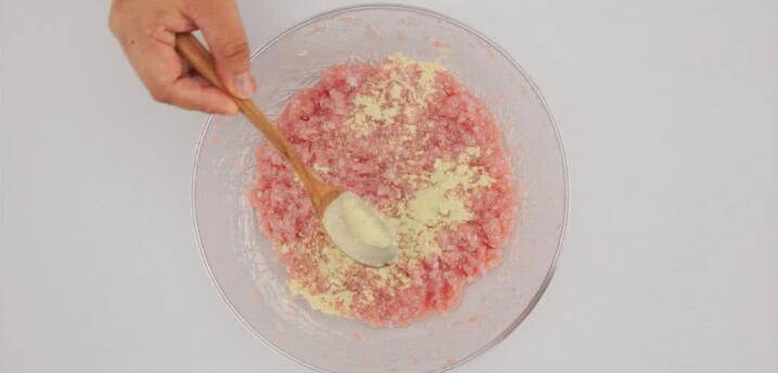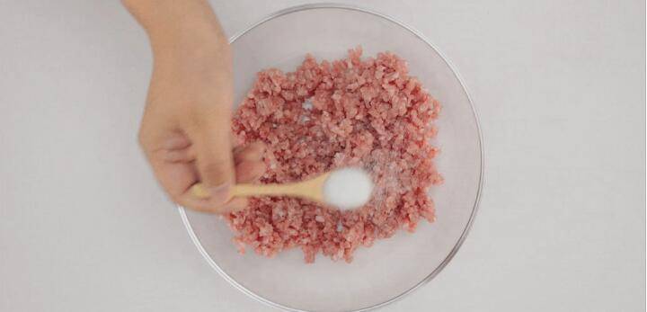 自制肉馅的用料:猪肉糜、盐、葱姜水、生抽、蚝油、芝麻油、白胡椒粉。