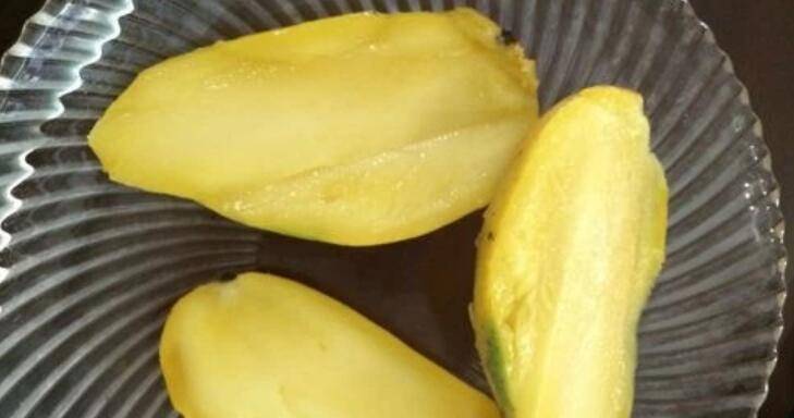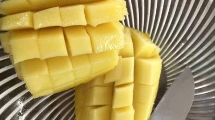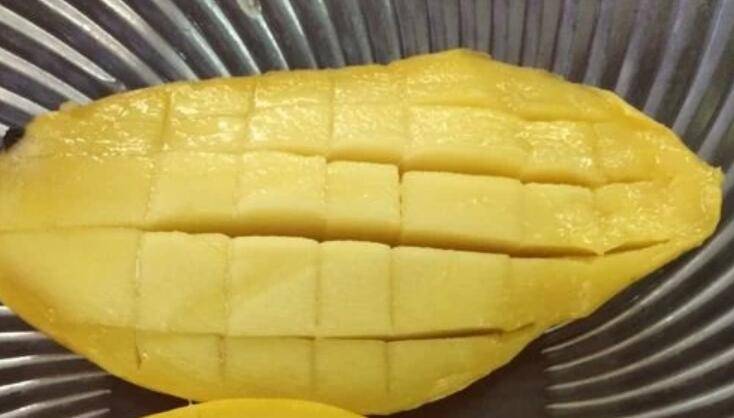 1、水果刀紧贴芒果核的两侧切开,将芒果切成三部分,两片纯果肉,一片带核。