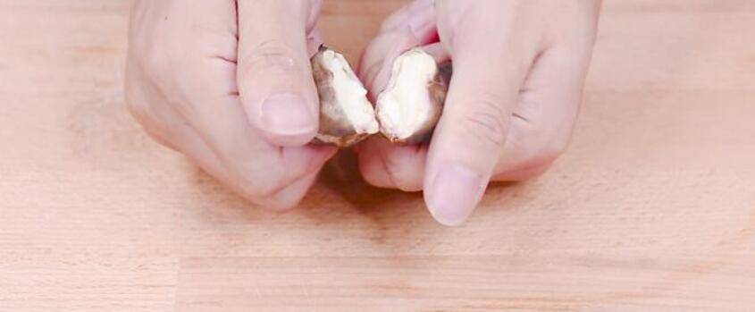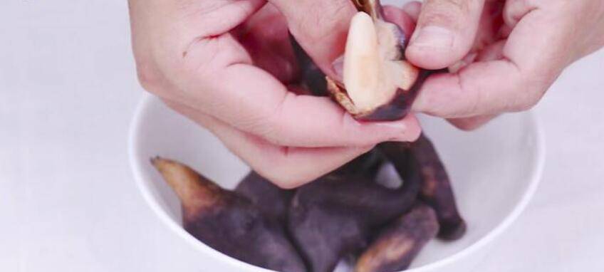 2、手挤开:菱角的两段是空心的,可以用手指挤压菱角的两端,将果肉从中间洞口挤出。