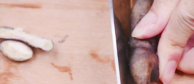 3、工具开:用菜刀在菱角底部切一刀,然后将横截面朝下,再用刀在菱角两侧各切一刀。用手掰住两个角,让拇指在凹进去的地方用力一掰,皮就会断开。