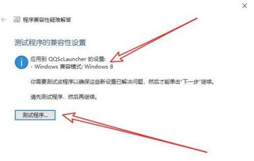 然后在打开的测试程序的兼容设置窗口,会自动的为应用设置兼容设置,我们点击“测试程序”看一下应用是否可以正常运行就可以了。