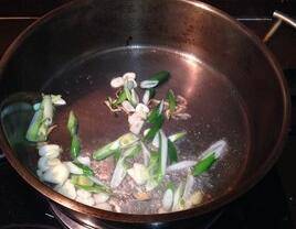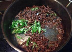 2、锅内放油烧热,煸干姜丝后放葱丝、蒜片、孜然粉、孜然粒,翻炒后再放入牛肉爆炒。