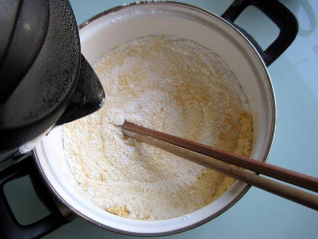 2、和好的面中倒入开水,用筷子搅拌。