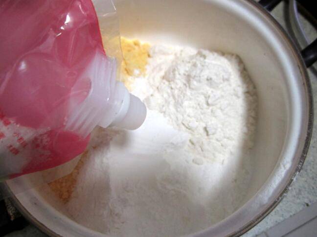 1、玉米面、糯米粉和面粉按3:2:1的比例放入容器中,加入白糖和匀。