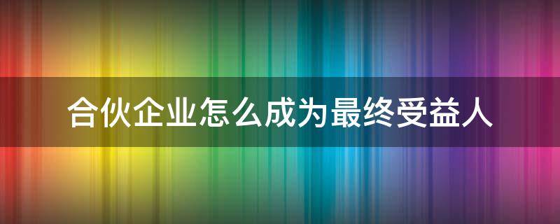合伙企业可以通过成为公司的股东再成为最终受益人。最终受益人一般应该指的是股东,不管关联、代持还是隐形股东,最终受益人就要承担股东的责任。合伙企业是指由各合伙人订立合伙协议,共同出资、共同经营、共享收益、共担风险,并对企业债务承担无限连带责任的营利性组织。也是指自然人、法人和其他组织依照《中华人民共和国合伙企业法》在中国境内设立的,由两个或两个以上的自然人通过订立合伙协议,共同出资经营、共负盈亏、共担风险的企业组织形式。