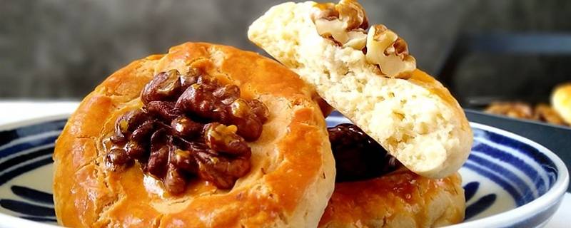 1、核桃酥饼:特色传统小吃,主要原料有面粉、核桃仁、油、糖、盐、鸡蛋、发酵粉、小苏打、芝麻等,核桃饼在烤箱中烘烤。