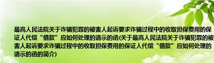 本文关于最高人民法院关于诈骗犯罪的被害人起诉要求诈骗过程中的收取担保费用的保证人代偿“借款”应如何处理的请示的函的简介就讲解完毕,希望对大家有所帮助。