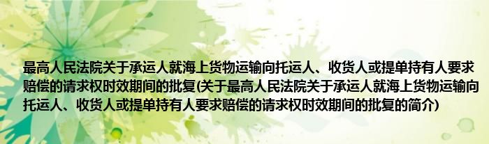 大家好,最高人民法院关于承运人就海上货物运输向托运人、收货人或提单持有人要求赔偿的请求权时效期间的批复,关于最高人民法院关于承运人就海上货物运输向托运人、收货人或提单持有人要求赔偿的请求权时效期间的批复的简介很多人还不知道,现在让我们一起来看看吧!