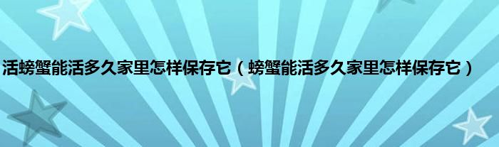 螃蟹通常能活五到七天。家里养螃蟹有两种方法。第一种是:把螃蟹放在浴缸里,倒入三厘米的水,定期把小鱼、泥鳅等食物放入螃蟹里,可以放五到十天。第二种是:把螃蟹的腿扎起来,放在冰箱的冷冻室里,盖上毛巾,可以保存三天。