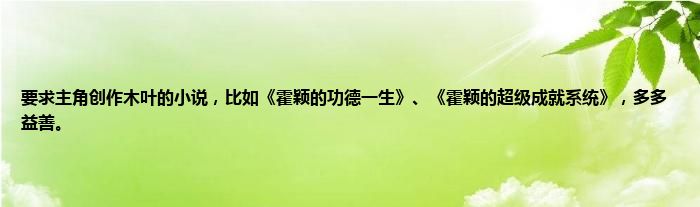 大家好,小常来为大家解答以上问题。要求主角创作木叶的小说,比如《霍颖的功德一生》、《霍颖的超级成就系统》,多多益善。很多人还不知道,现在让我们一起来看看吧!