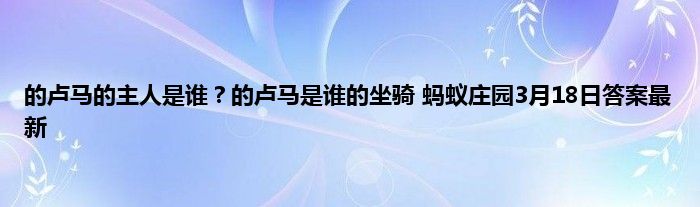 蚂蚁庄园小课堂当中每天会给玩家带来一些问题供玩家来回的,当你回答出正确的问题之后就可以拿取到饲料奖励。3月18日的最新问题就是的卢马的主人是谁?的卢马是谁的坐骑?可能一些玩家不知道今天的问题答案是什么。那下面就让小编给玩家带来3月18日蚂蚁庄园小课堂最新的答案介绍吧。