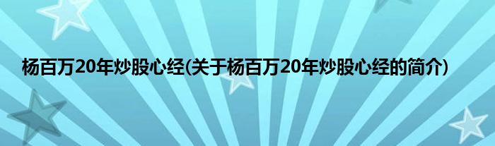 本文关于杨百万20年炒股心经的简介就讲解完毕,希望对大家有所帮助。