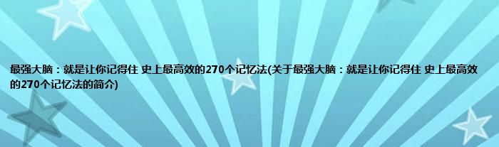 本文关于最强大脑:就是让你记得住,史上最高效的270个记忆法的简介就讲解完毕,希望对大家有所帮助。