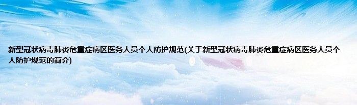 大家好,新型冠状病毒肺炎危重症病区医务人员个人防护规范,关于新型冠状病毒肺炎危重症病区医务人员个人防护规范的简介很多人还不知道,现在让我们一起来看看吧!